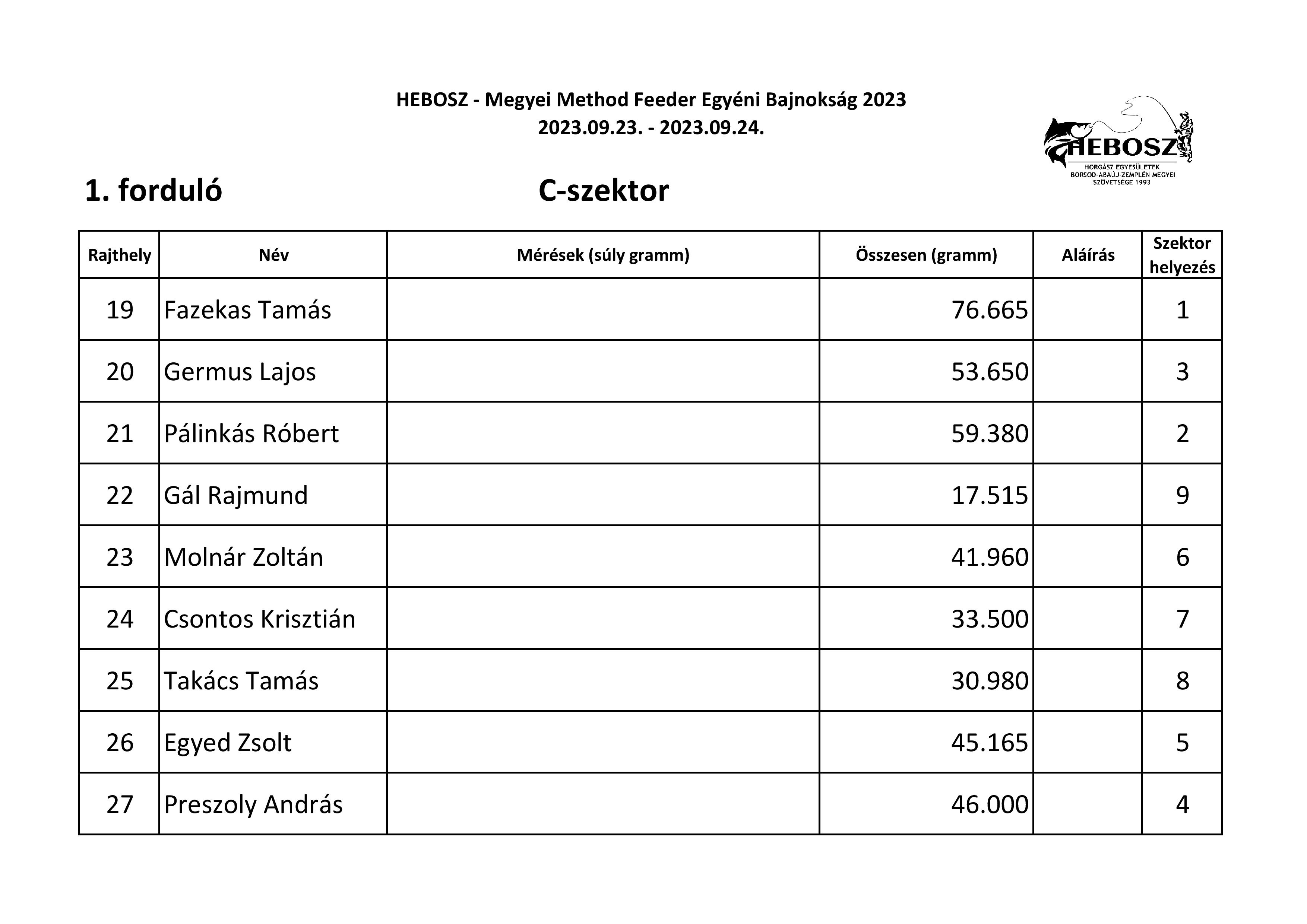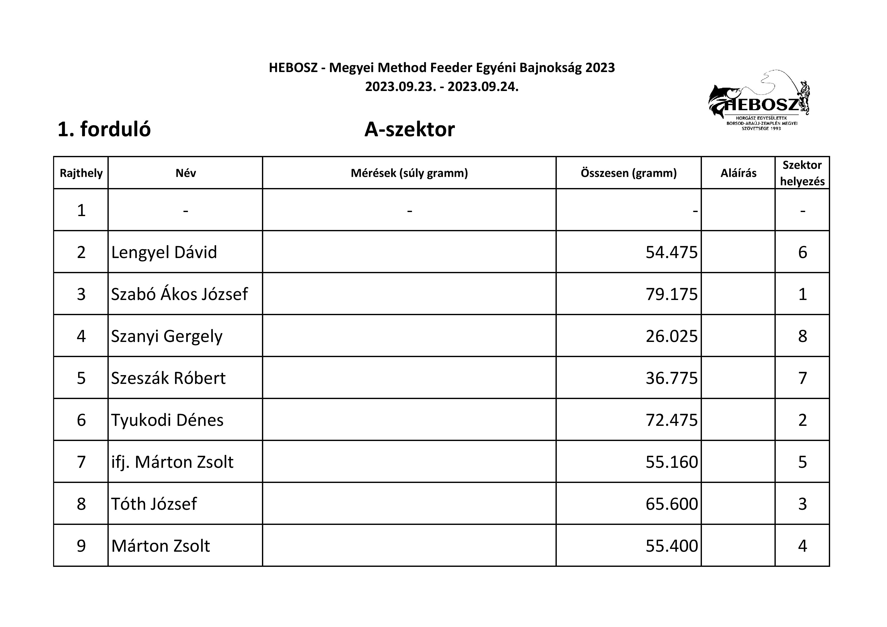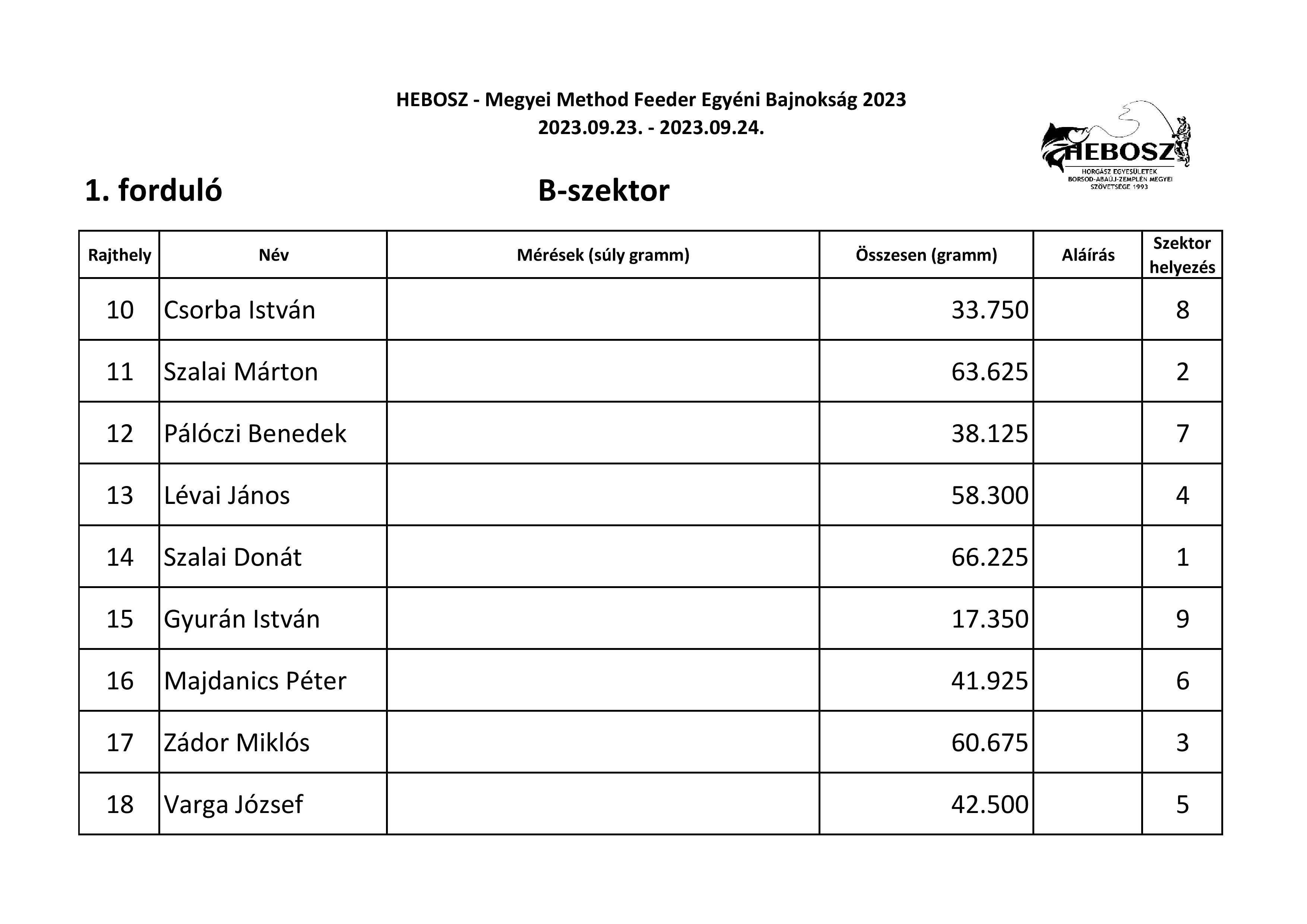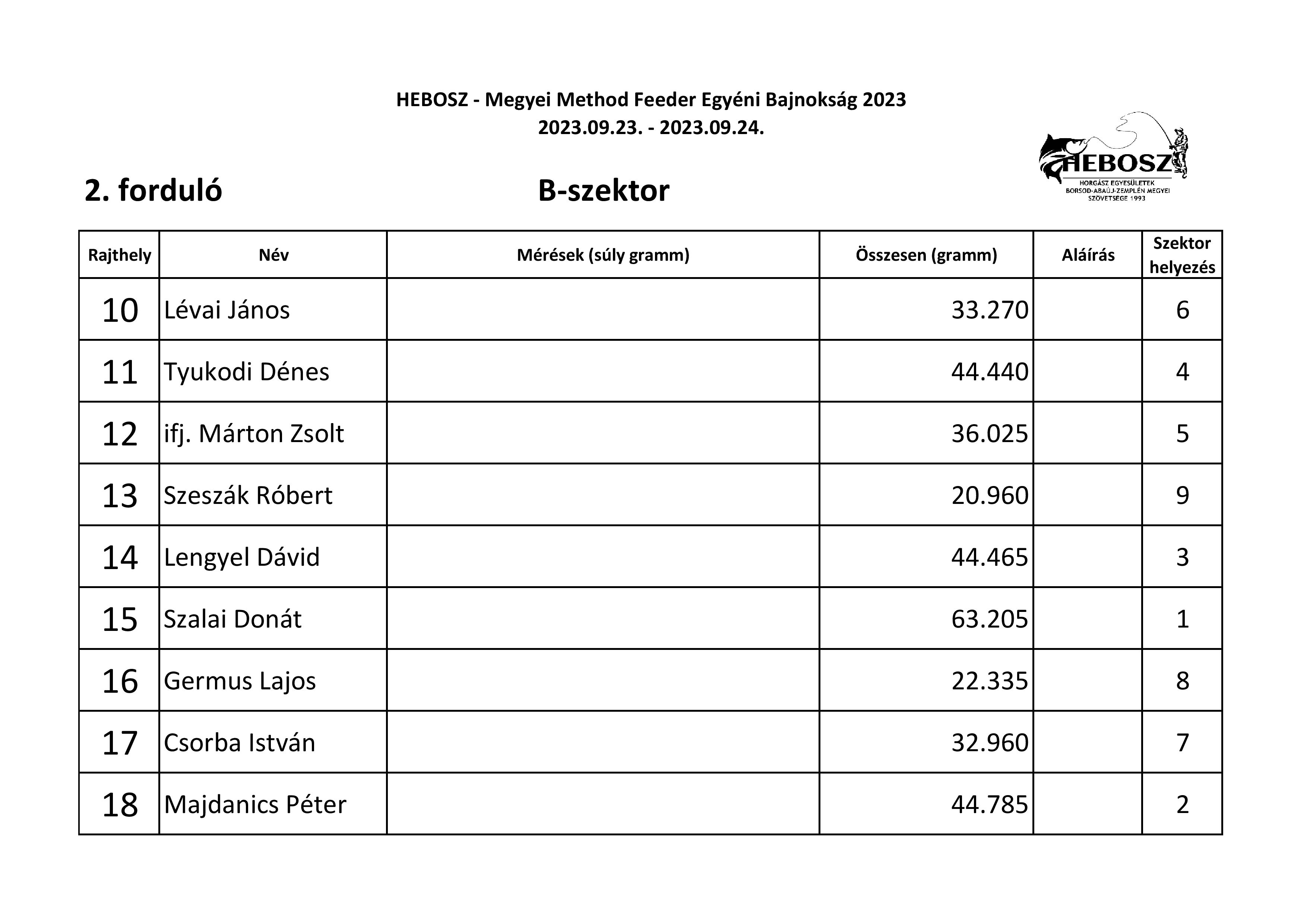 Mondhatni ömlött a hal az idei Megyei Method Bajnokságon, amit szövetségünk az idén már két fordulóban rendezett a Nagycsécsen található Családi horgász tavon. A method szakág népszerűségét mutatja, hogy a meghirdetett maximum 27 fős nevezési létszám gyakorlatilag a versenykiírás megjelenésétől számítva néhány napon belül megtelt. Végül a verseny első napján 26 fő versenyző jelent meg, akiket három szektorban osztottunk szét. A kezdő dudaszó után volt, ahol az első dobást rögtön kapás és fárasztás követte. Jól jellemzi a tó halállományát, hogy 10 perccel a verseny kezdete után az egyik szektorban már minden versenyzőnek ponty volt a haltartóban, de gyakori kép volt a verseny során, hogy egyszerre 5-6 ember fárasztott egymás mellett. Az első fordulóban az A-szektorban Szabó Ákos József gyorsan az élre állt, a nap végén 79 kg fölé mérlegelt, pedig három haltartót is túlrakott. Itt második a nagyot hajrázó és címvédő Tyukodi Dénes lett, harmadik pedig Tóth József. A B-szektorban csak lassan épült fel Szalai Donát pecája, ám a végére szépen kikerekedett és megnyerte a szektort. Mögötte fia Szalai Márton és Zádor Miklós végzett. A C-szektorban Fazekas Tamás már az első dobás után fárasztott és a szektor első helyet sem adta ki a kezéből, mögötte Pálinkás Róbert lett a második, Germus Lajos pedig a harmadik. A mezőny összefogása az első fordulóban 1200 kg felett volt.